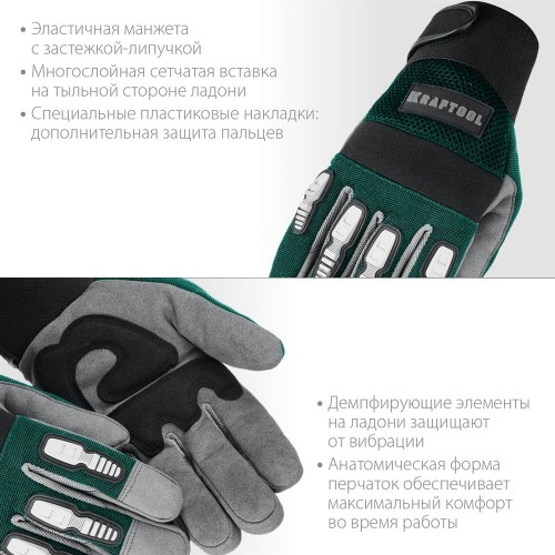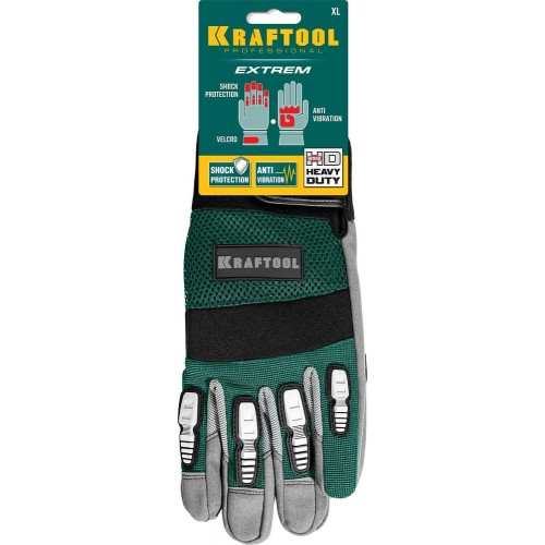Профессиональные комбинированные перчатки KRAFTOOL EXTREM 11287-XL, предназначены для защиты рук при выполнении механических работ в тяжелых условиях. Специальные пластиковые накладки обеспечивают дополнительную защиту пальцев. Эластичная манжета с застежкой-липучкой надежно фиксирует перчатки на руках. Многослойная сетчатая вставка на тыльной стороне ладони создает отличную воздухопроницаемость. Двойные плоские швы и анатомическая форма перчаток способствуют повышенному комфорту при выполнении работ.