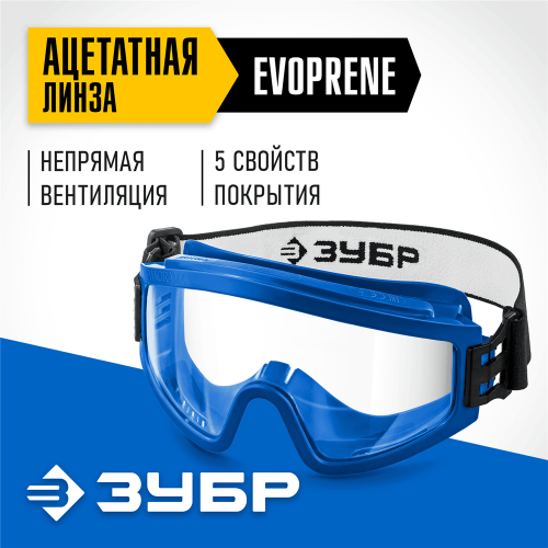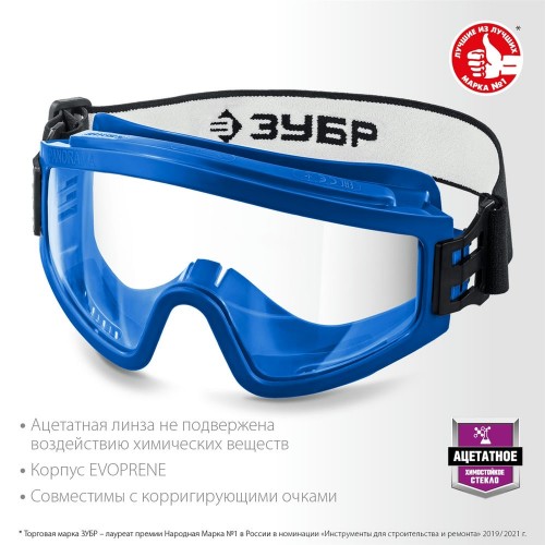 Панорамные защитные очки ЗУБР ПАНОРАМА ХС 110235_z01, предназначены для защиты органов зрения от твердых летящих частиц и брызг не разъедающих жидкостей. Химически стойкая ацетатная линза обеспечивает превосходную защиту при работе с аэрозолями и жидкостями. Оснащены воздуховодами непрямой вентиляции, позволяющими работать в пыльной среде. Ударопрочный материал линзы превосходно защищает от мелких летящих частиц. Оптический класс 1 - линза не создает искажения. Панорамная линза обеспечивает превосходный обзор. Защитное покрытие - анти-запотевающее, устойчивое к царапанию и истиранию, самополирующий эффект, антистатичное. Широкая эластичная лента оптимальна для надежной фиксации на голове.