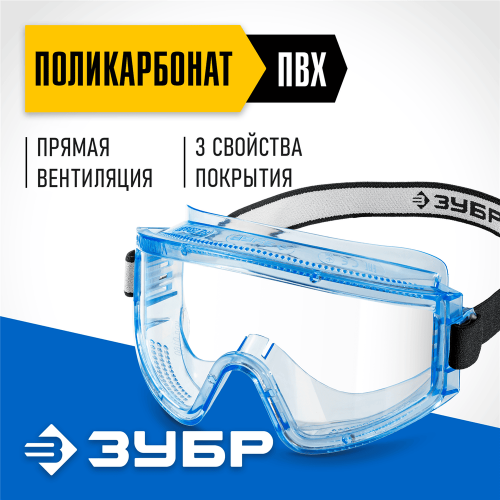Панорамные защитные очки ЗУБР ПАНОРАМА П 110231, предназначены для защиты органов зрения от механических воздействий, от повышенных температур (от брызг расплавленного металла и горячих частиц). Прямая вентиляция обеспечивает свободную циркуляцию воздуха. Панорамное стекло обеспечивает широкий угол обзора. Антизапотевающее покрытие на внутренней стороне, устойчивое к истиранию и царапанам снаружи. Возможность использования с корригирующими очками. Мягкий и комфортный для ношения ПВХ корпус. Регулируемая наголовная лента.