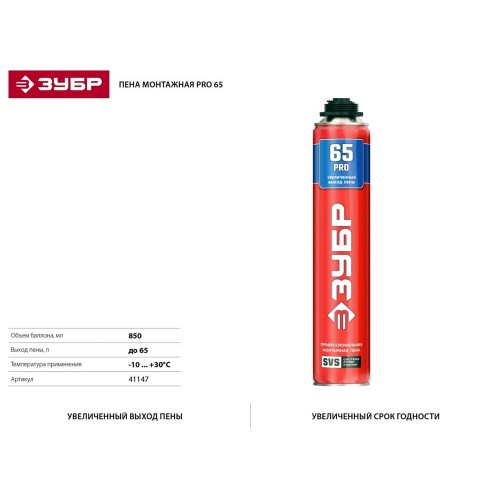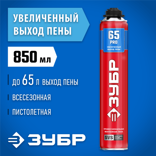 ЗУБР 850 мл, выход до 65 л, пистолетная, монтажная пена ПРО 65 41147_z01