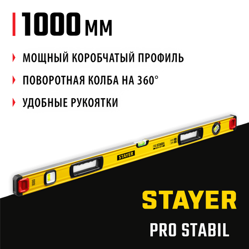 Уровень строительный STAYER 3471-100_z02, предназначен для контроля горизонтальности и вертикальности поверхностей. Специальный усиленный профиль конструкции. Две фрезерованные поверхности. Эластичные заглушки поглощают удар при падении. Точность измерений 0.5 мм/м. 3 колбы из ударопрочного акрила. Поворотная колба на 360°.