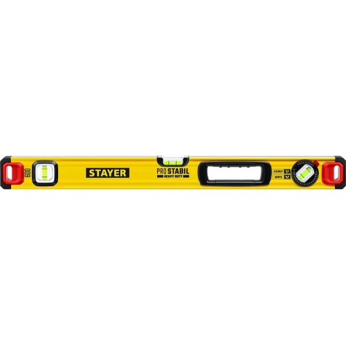 Уровень строительный STAYER 3471-060_z02, предназначен для контроля горизонтальности и вертикальности поверхностей. Специальный усиленный профиль конструкции. Две фрезерованные поверхности. Эластичные заглушки поглощают удар при падении. Точность измерений 0.5 мм/м. 3 колбы из ударопрочного акрила. Поворотная колба на 360°.