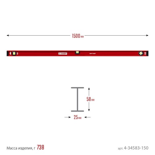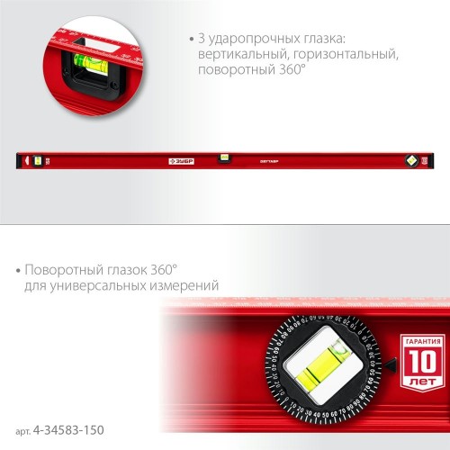 Уровень строительный ЗУБР 4-34583-150_z01, предназначен для контроля горизонтальности и вертикальности поверхностей. Точность измерений 1 мм/м. Фрезерованная базовая поверхность. 3 ударопрочные колбы. Поворотная колба на 360°.