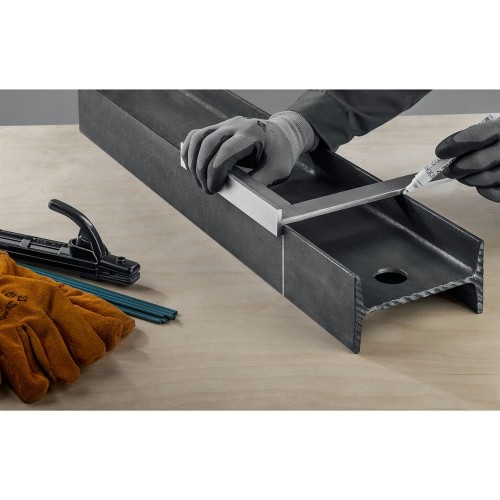 Мощный профессиональный цельнометаллический угольник со стальным полотном толщиной 5 мм и широким основанием.