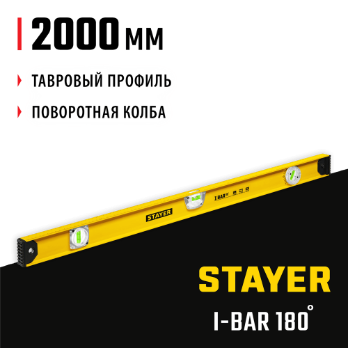 Уровень строительный STAYER 3470-200_z02, предназначен для контроля горизонтальности и вертикальности поверхностей. Тавровый профиль с дополнительными ребрами жесткости. V-образная выемка для труб. 3 колбы из ударопрочного акрила. Поворотная колба на 360°.