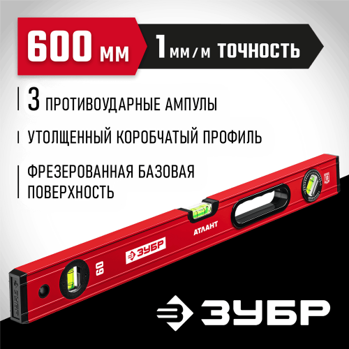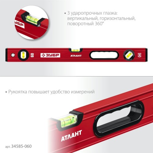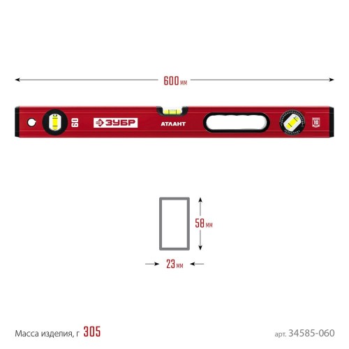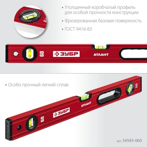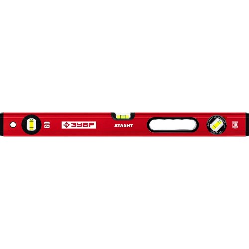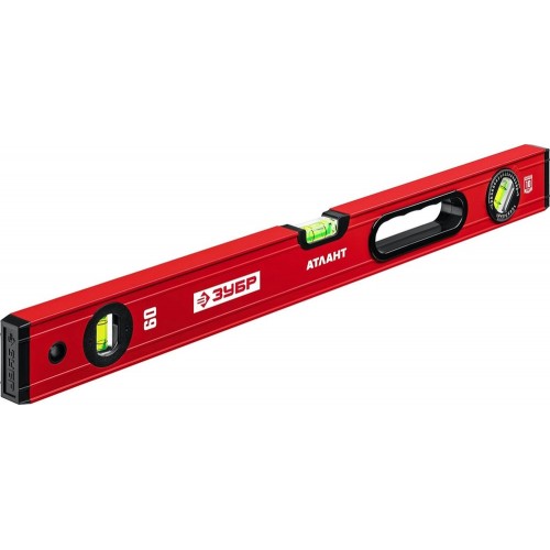Уровень строительный ЗУБР 34585-060_z01, предназначен для контроля горизонтальности и вертикальности поверхностей. Усиленный профиль для повышения прочности конструкции. 3 ударопрочные колбы.