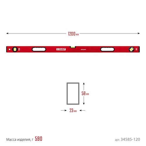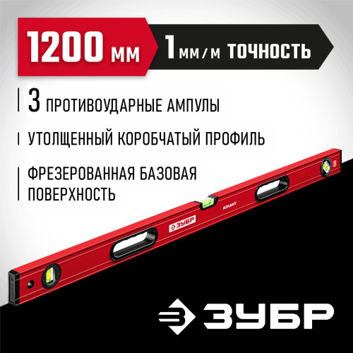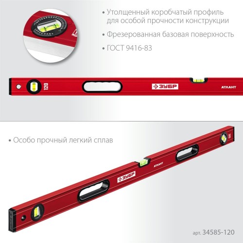 Уровень строительный ЗУБР 34585-120_z01, предназначен для контроля горизонтальности и вертикальности поверхностей. Усиленный профиль для повышения прочности конструкции. 3 ударопрочные колбы. Рукоятки повышают удобство измерений.