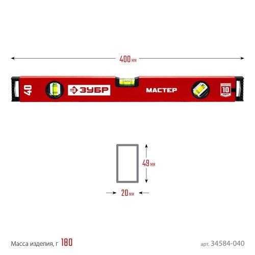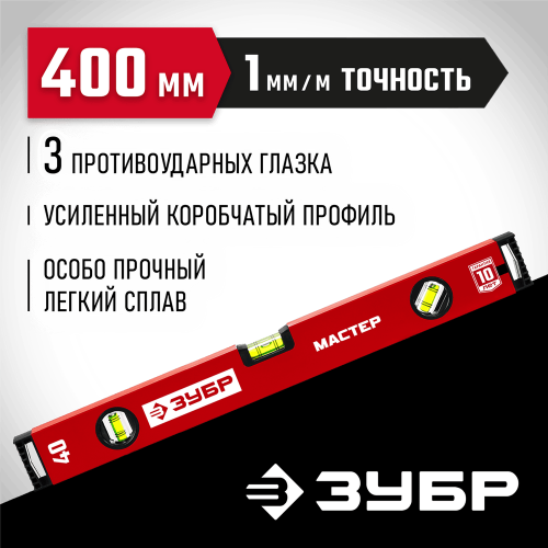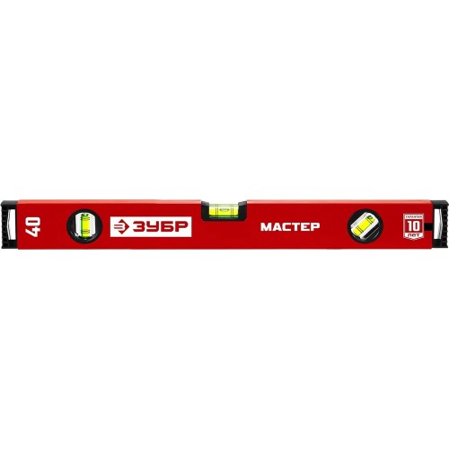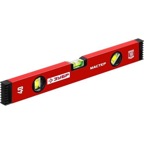 Строительный уровень ЗУБР 34584-040_z01, предназначен для контроля горизонтальности и вертикальности поверхностей. Точность измерений 1 мм/м. 3 ударопрочные колбы. Колба под углом 45°.