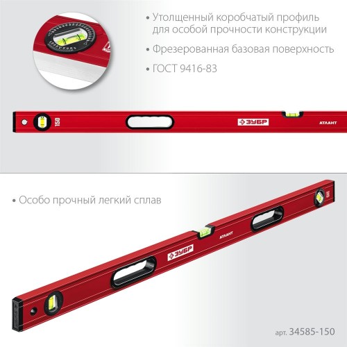 Уровень строительный ЗУБР 34585-150_z01, предназначен для контроля горизонтальности и вертикальности поверхностей. Усиленный профиль для повышения прочности конструкции. 3 ударопрочные колбы. Рукоятки повышают удобство измерений.