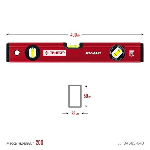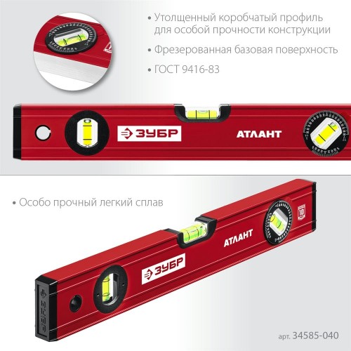Уровень строительный ЗУБР 34585-040_z01, предназначен для контроля горизонтальности и вертикальности поверхностей. Усиленный профиль для повышения прочности конструкции. 3 ударопрочные колбы.