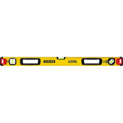 Уровень строительный STAYER 3471-080_z02, предназначен для контроля горизонтальности и вертикальности поверхностей. Специальный усиленный профиль конструкции. Две фрезерованные поверхности. Эластичные заглушки поглощают удар при падении. Точность измерений 0.5 мм/м. 3 колбы из ударопрочного акрила. Поворотная колба на 360°.