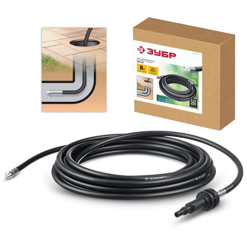Шланг для прочистки труб ЗУБР 70414-180-8, предназначен для прочистки труб (сливных, дождевых, канализационных) от загрязнений путем подачи струй высокого давления. Мощные струи сбивают грязь со стенок трубы с одновременным продвижением в канале. Быстросъемное соединение. Шланг имеет стекловолоконное армирование. Подходит для моек АВД-115, АВД-140, АВД-160, АВД-180.
