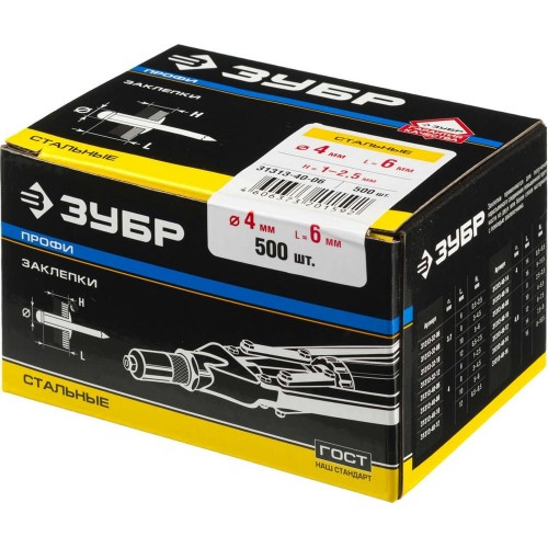 Заклепки стальные ЗУБР 31313-40-06, предназначены для получения неразъемного соединения из двух или более слоев материалов с помощью заклепочника. Корпус заклепки изготовлен из высококачественной оцинкованной стали, что обеспечивает защиту от коррозии. Конструкция бортика обеспечивает надежную герметичность соединения. Для монтажа заклепок достаточно иметь доступ с одной стороны скрепляемых материалов, монтаж соединения осуществляется при помощи заклепочника.
