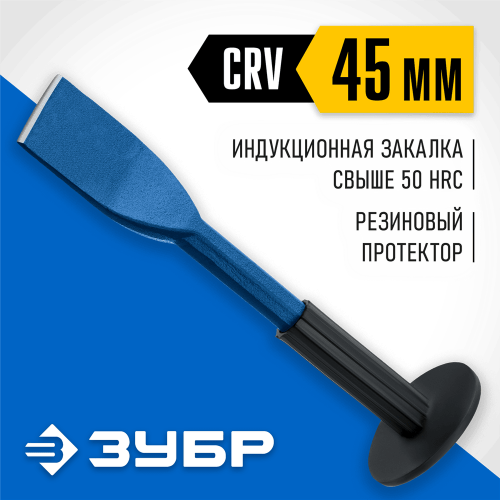 Зубило-конопатка с протектором ЗУБР 2123-45, предназначено для рубки или раскалывания различных материалов, конопатки срубов. Обрезиненная рукоятка с протектором способствует надежному хвату и защищает руки от удара молотком.