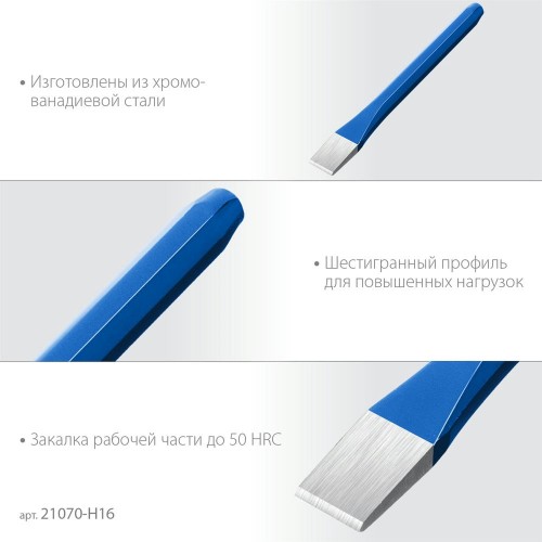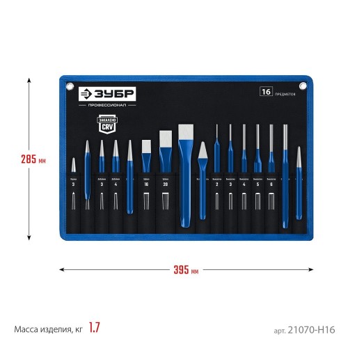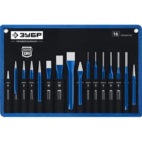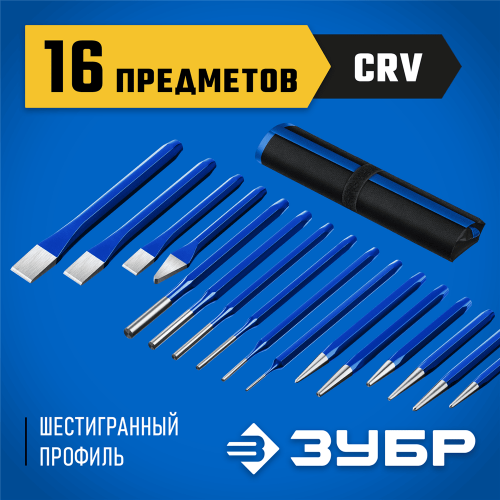 Набор зубил и кернеров в чехле ЗУБР 21070-H16, предназначен для рубки или раскалывания различных материалов, накернивания насечек. Инструменты изготовлены из хромованадиевой стали. Шестигранный профиль для повышенных нагрузок.
