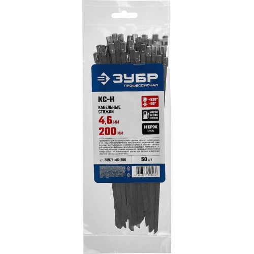 Кабельные стяжки ЗУБР 30971-46-200, предназначены для быстрой стяжки кабелей электропроводки в пучок и их крепления к различным элементам конструкции при проведении электромонтажных работ.