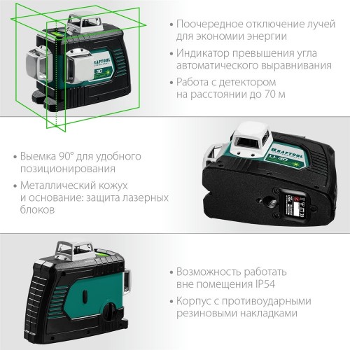 • 3 режима проецирования линий: горизонтальная и две вертикальные линии с развёрткой 360°, благодаря чему луч будет виден в любой точке.