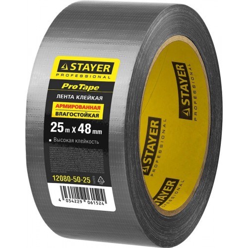 Армированная лента STAYER 12080-50-25, предназначена для склейки, упаковки, запечатывания, герметизации. Для использования внутри и снаружи помещений. Влагостойкая клейкая лента на тканевой основе обеспечит высокую клейкость, удобство применения и хранения.