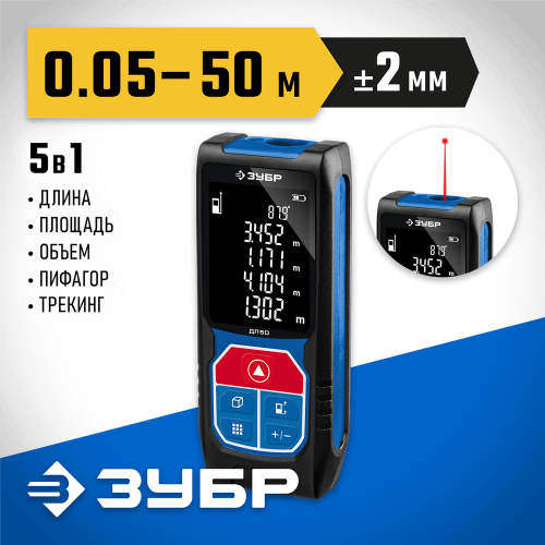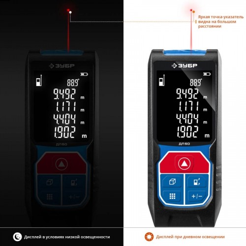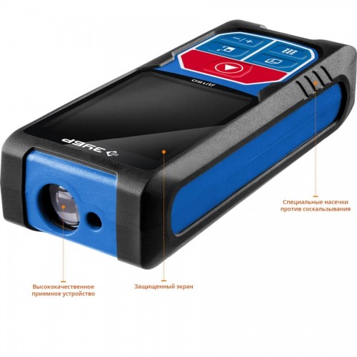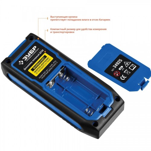 Дальномер лазерный ЗУБР 34925, предназначен для быстрого и простого измерения линейных расстояний, площадей и объемов. Компактный размер обеспечивает удобство проведения измерений и транспортировки. Энергосберегающее отключение лазерного луча (через 30 сек) и прибора (через 60 сек). Функция сложения/вычитания измерений. Пять измерительных функций: длина, площадь, объем, косвенные измерения (пифагор), непрерывные измерения (трекинг). Звуковое сопровождение операций. Индикатор разряда батареи. Две точки отсчета: фронт, тыл. Диапазон измерений, точность и быстродействие зависят от отражающей способности объектов и яркости окружаю-щего освещения. Для измерения малых расстояний (от 5 до 20 см) следует перевести прибор в режим измерения от переднего края. Компактный размер, максимальная точность при измерениях.