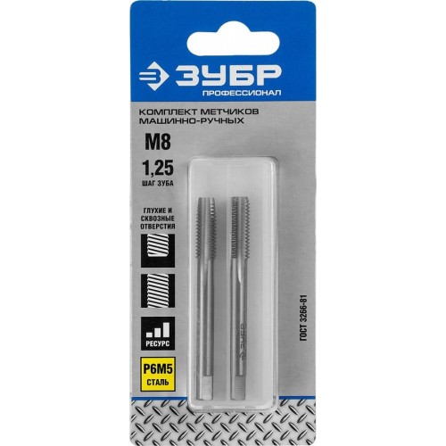 Набор метчиков ЗУБР 4-28007-08-1.25-H2_z01, предназначен для нарезания внутренней метрической резьбы в сквозных и глухих отверстиях в сталях и цветных металлах. Изготовлен из быстрорежущей стали Р6М5 по ГОСТ 3266-81.