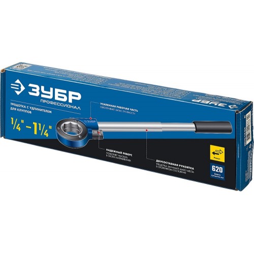 Трещотка с удлинителем к клуппам ЗУБР 28275-1/4-5/4_z02, предназначена для формирования внешней резьбы на металлических трубах стандартного диаметра.
