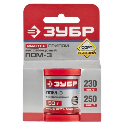 Припой для пайки ЗУБР 55456-050-10, предназначен для проведения паяльных работ. Изготовление припойных паст, пайка теплообменников в машиностроении, пайка фитингов медных труб. Соответствует ГОСТ 21931-76.