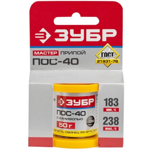 Припой для пайки ЗУБР 55451-050-10C, предназначен для проведения паяльных работ. Лужение и пайка элементов электроаппаратуры, деталей из оцинкованного железа с герметичными швами, медных проводов и латуни; соединение элементов, подверженных вибрационным нагрузкам. Применяется при пайке изделий из меди, железа, латуни. Соответствует ГОСТ 21931-76.