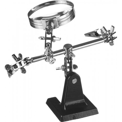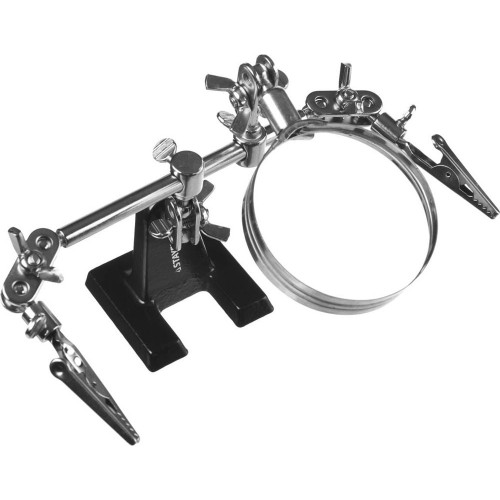 Штатив освобождает руки и позволяет легко осуществлять паяльные работы на электронной плате при помощи зажимов для крепления и поворотного механизма и качественной линзы. Необходимой при пайке элементов малого размера.