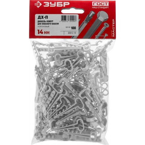 Дюбель-хомут для плоского кабеля ЗУБР 30912-14, предназначен для крепления кабелей, проводов, металлорукавов или гофрорукавов к полнотелым основаниям (бетон, кирпич, природный камень). Изготовлены из высококачественного полипропилена. Конструкция дюбель-хомута исключает из процесса монтажных работ дюбели и саморезы. Благодаря этому повышается скорость и удобство монтажных работ.