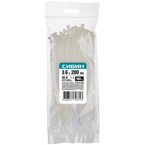 Хомуты нейлоновые белые СИБИН 3786-36-200, предназначены для быстрой стяжки кабелей электропроводки в пучок и их крепления к различным элементам конструкции при проведении электромонтажных работ.