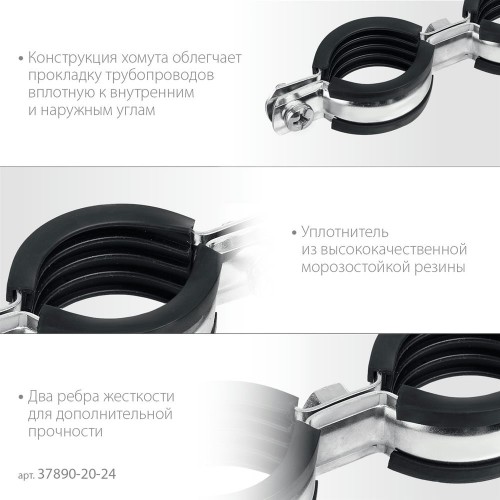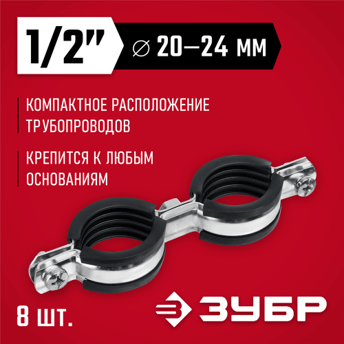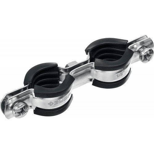 Хомут трубный оцинкованный ЗУБР 37890-20-24, предназначен для крепления труб различного назначения к любым основаниям при помощи сантехнической шпильки и дюбеля (не входит в комплект поставки). Экономия на материалах и времени монтажа: одна шпилька и один хомут на 2 трубопровода, для зажима труб закручиваются два винта вместо четырех. Конструкция хомута облегчает прокладку трубопроводов вплотную к внутренним и наружным углам. Уплотнитель из высококачественной морозостойкой резины поглощает вибрацию (шум). Два ребра жесткости придают изделию дополнительную прочность. Цинковое покрытие надежно защищает от коррозии.
