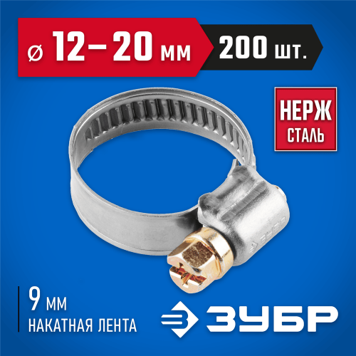 ЗУБР 200 шт., 12-20 мм, нерж. сталь, накатная лента 9 мм, хомуты 37820-12-20-200 Профессионал