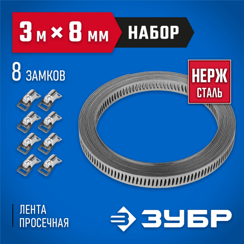 - В комплект набора входят нержавеющая просечная лента 8 мм х 3 м и 8 универсальных замков