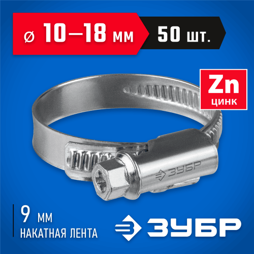 ЗУБР 50 шт, 10-18 мм, оцинкованный, червячный хомут Х-9Н 37807-18