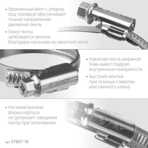 Червячный хомут ЗУБР 37807-18 предназначен для крепления шлангов к патрубкам, работающим в условиях низких и средних давлений и вибраций, а также кабелей и проводов. Состоит из штампованной ленты и винта с червячной резьбой. Накатная лента с гладкой внутренней поверхностью предотвращает повреждения скрепляемых материалов. Шестигранная головка и шлиц PH позволяют использовать при монтаже гаечный ключ или шлицевую отвертку. Цинковое покрытие надежно защищает от коррозии.