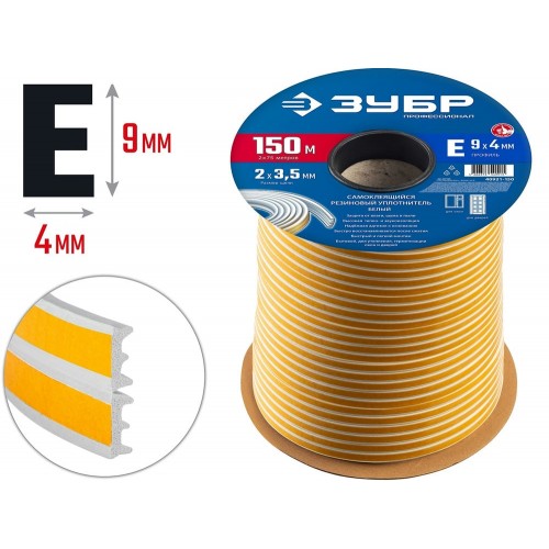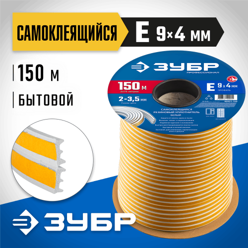 ЗУБР E-профиль, размер 9 х 4мм, белый, 150м, самоклеящийся резиновый уплотнитель (40921-150)