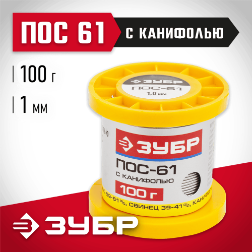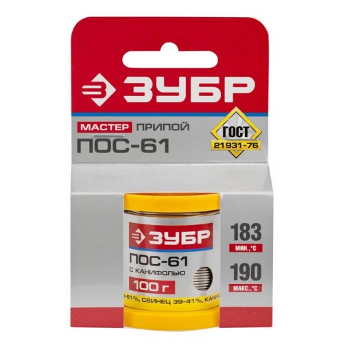 Припой для пайки ЗУБР 55450-100-10C, предназначен для проведения паяльных работ. Лужение и пайка элементов электро- и радиоаппаратуры, печатных схем, точных приборов с высокогерметичными швами, где недопустим перегрев; пайка жести, обмоток электрических машин, монтажных элементов, моточных и кабельных изделий, радиаторов и листового цинка, оцинкованных деталей холодильных агрегатов, теплообменников, электроламп, кабельных оболочек, тонколистовой упаковки. Применяется при пайке изделий из меди, цинка, железа. Соответствует ГОСТ 21931-76.