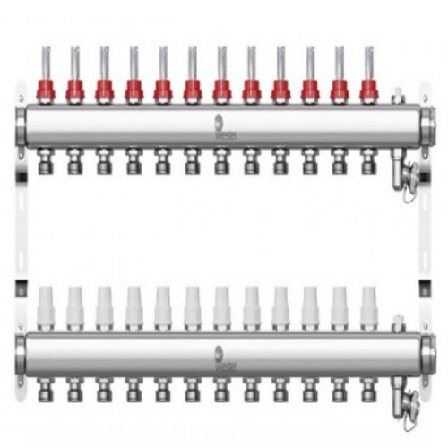 | Комплект поставки | Корпус коллектора, шт. - 2; Регулировочный клапан с расходомером, шт. - 12; Запорный клапан, шт. - 12; Кронштейн, шт. - 2; Гильза фиксирующая, шт. -2; Заглушка, шт. - 2; Воздухоудалитель, шт. - 2; Кран дренажный, шт. - 2. |