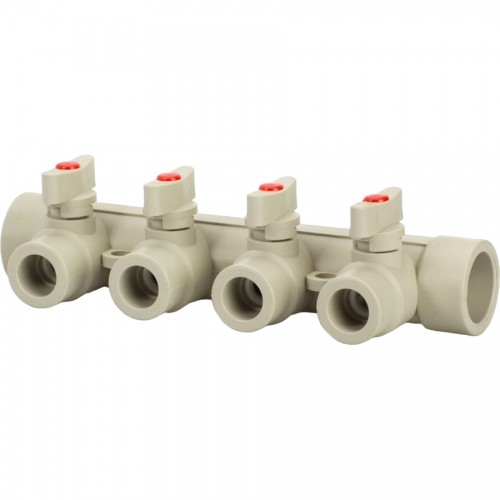 Коллектор с шаровыми кранами LAMMIN PPR представляет собой подающую трубу, на которой расположено три шаровых крана из полипропилена. Запирающие элементы шаровых кранов выполнены из нержавеющей стали. Коллектора для воды выполняют функцию подключения к одному источнику тепла нескольких распределительных трубопроводов.