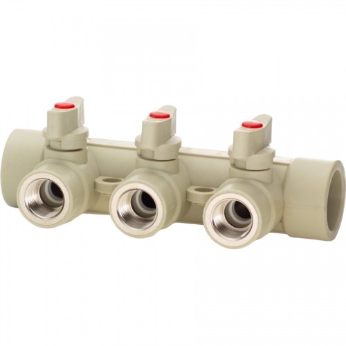 Коллектор с шаровыми кранами LAMMIN PPR представляет собой подающую трубу, на которой расположено три шаровых крана из полипропилена. Запирающие элементы шаровых кранов выполнены из нержавеющей стали. Коллектора для воды выполняют функцию подключения к одному источнику тепла нескольких распределительных трубопроводов.