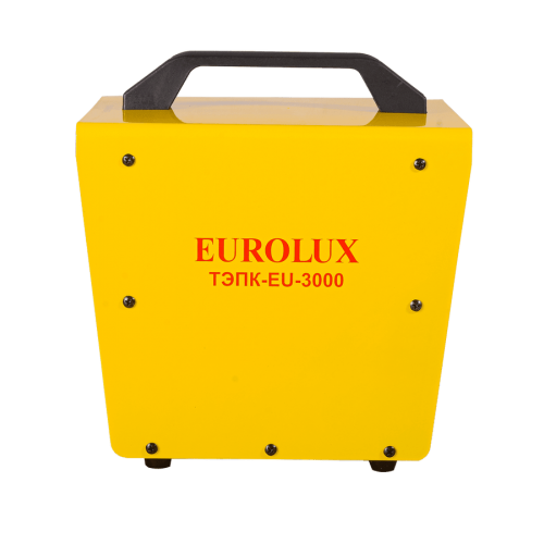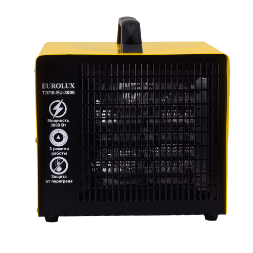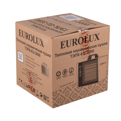 Корпус тепловой пушки металлический, имеет квадратную форму и перфорированную решётку. Сверху имеется удобная пластиковая ручка. Органы управления в виде переключателей режимов работы и регулятора оборотов вентилятора вынесены на тыльную сторону. Установка модели Eurolux ТЭПК-EU-3000 напольная. Для исключения скольжения по напольным покрытиям предусмотрены ножки. Электрическая тепловая пушка работает от бытовой сети 220 В, 50 Гц.