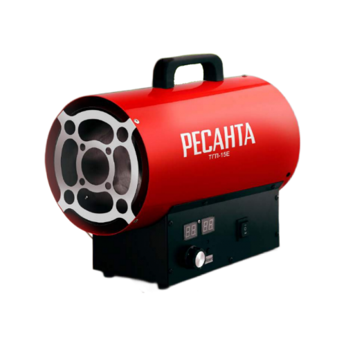 Тепловая газовая пушка ТГП-15E Ресанта - воздухонагреватель, работающий на сжиженном газовом топливе. Топливо необходимо для получения горячей атмосферы в камере сгорания, а электроэнергия, подводимая к устройству, необходима для питания вентилятора, нагнетающего воздух, и для функционирования автоматики.
