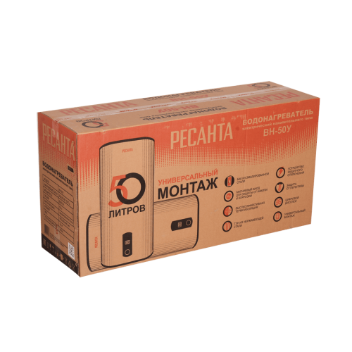 Ресанта ВН-50У устанавливается в горизонтальном или вертикальном положении и подключается к стандартной сетевой розетке 220 В. Специальная крепежная планка обеспечивает надежную фиксацию, предотвращая случайное соскальзывание. Накопительный водонагреватель имеет магниевый анод, препятствующий развитию коррозии на стенках бака и сварных швах. Максимальная безопасность эксплуатации достигается за счет УЗО: при пробое кабеля и утечках тока на корпус оно мгновенно отсоединяет устройство от электросети.