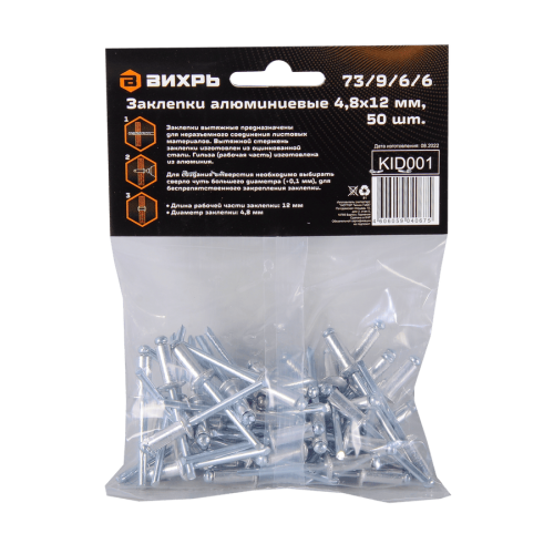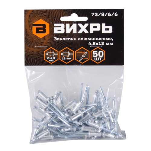 Заклёпки алюминиевые Вихрь 4,8х12 мм имеют диаметр 4.8 мм и длину гильзы 12 мм. В упаковке 50 штук.