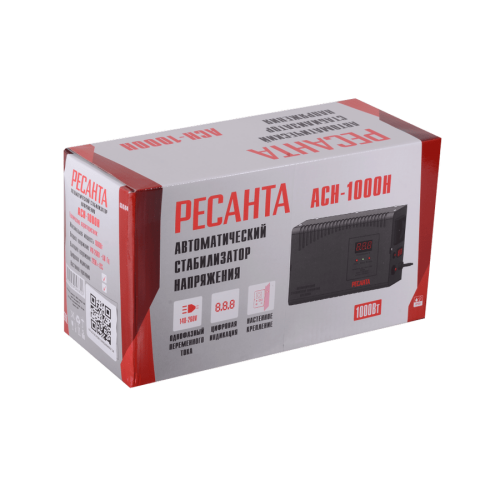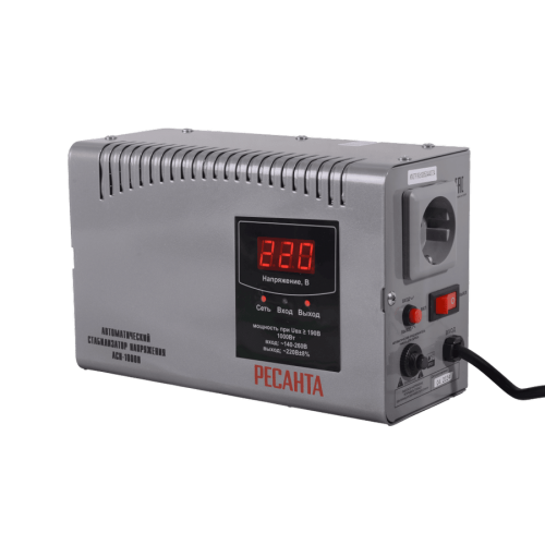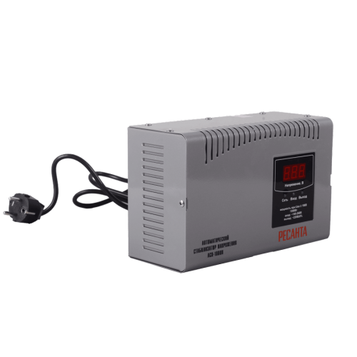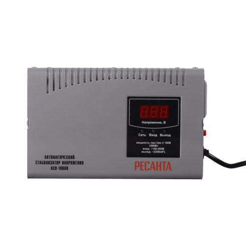 Стабилизатор напряжения Ресанта АСН-1000 Н —устройство, предназначенное для защиты электроприборов от скачков в электросети. С максимальной мощностью 1000 Вт он обеспечивает стабилизацию выходного напряжения на уровне 220 В с точностью ±8%. При этом входное напряжение может быть в диапазоне от 140-260 В.