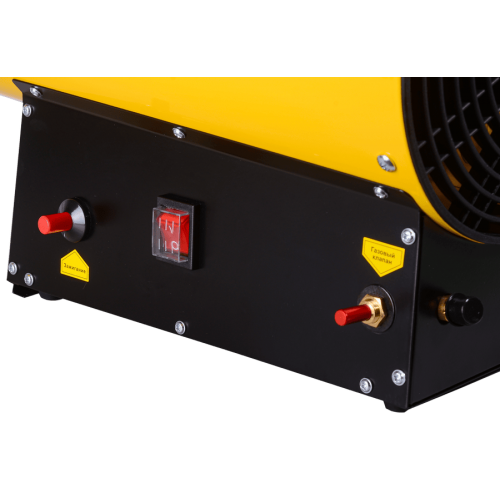 - Двигатель работает на сжиженном газе – пропане, пропан-бутане или бутане. Он поставляется в баллонах. Для подключения предусмотрен редуктор и соединительный шланг. Для функционирования понадобится также розетка 220-230 В. От электричества работает вентилятор.