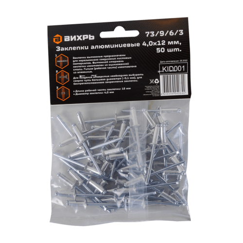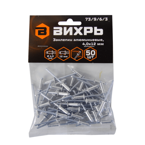 Заклёпки алюминиевые Вихрь 4,0х12 мм имеют диаметр 4.0 мм и длину гильзы 12 мм. В упаковке 50 штук.