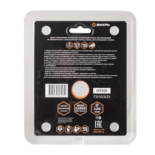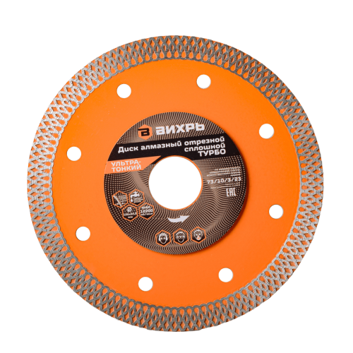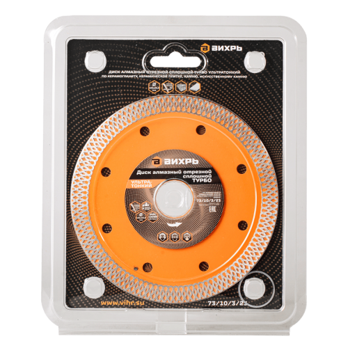 Диск алмазный отрезной сплошной турбо ультратонкий Вихрь имеет диаметр 125 мм и посадочный диаметр 22,2 мм. Диск предназначен для резки сухим/мокрым методом.
