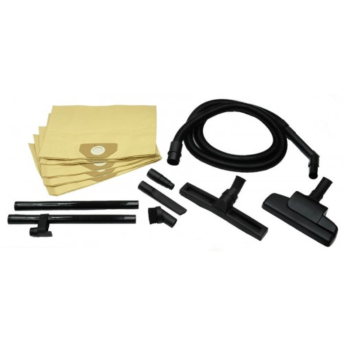 Шланг гофрированный 3м - 1шт, труба - 2шт, универсальная насадка для сухой уборки - 1шт, насадка для влажной уборки - 1шт, щелевая насадка - 1шт, насадка для мебели - 1шт, переходник ступенчатый (наружный диаметр 26,33,36,40мм, внутренний диаметр 22мм), основной картридж-фильтр - 1шт, мешок пылесборный бумажный - 5шт.
