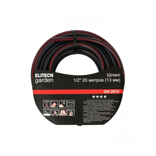 Гибкий шланг Elitech Garden GH 2012 имеет длину 20 метров и внутренний диаметр 13 мм (1/2').
